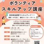 2026年2月4日 / Last updated : 2026年2月4日 shakyoadmin お知らせ つながるプロジェクト「ボランティア スキルアップ講座 ~救命救急講習でスキルアップ~」 参加者募集! つながるプロジェクト「ボランティアスキルアップ講座 ~救命救急講習でスキルアップ~」を開催します! ボランティア活動や日常生活で,いざというときのために 救命救急の知識と技術を身につけておきませんか? また,安心してボラ […]